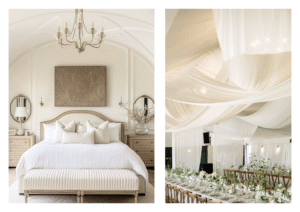 - Eventos boutique: caminos de mesa, conos de pétalos, fundas de sillas y cortinajes etéreos para backdrops.